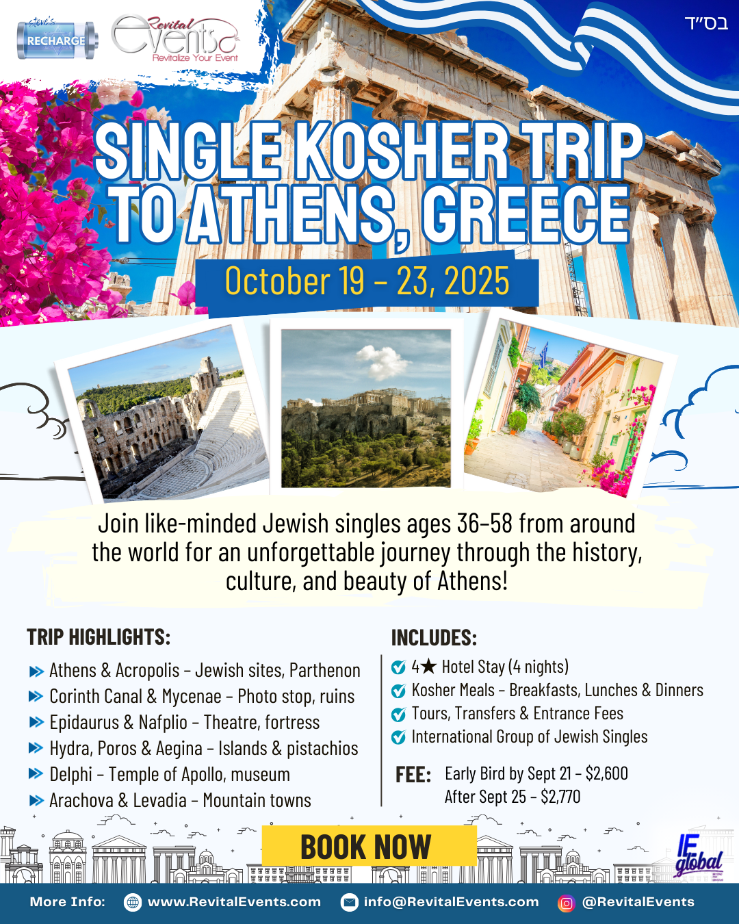 Discover Greece with us on a 5-day kosher journey for Jewish singles ages 36–58, filled with history, culture, breathtaking scenery, and warm Jewish heritage. Everything is arranged for you — from guided tours to delicious kosher meals — so you can simply enjoy the experience.